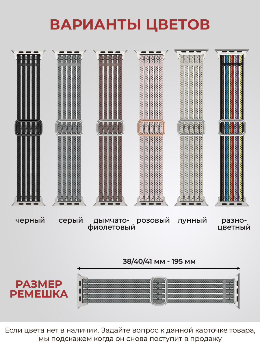 Ремешок для Apple Watch 40 сочетает в себе стиль и функциональность. Женский ремешок для Апл Вотч представлен в однотонных оттенках и в разноцветных цветах, что позволит выбрать вариант, который идеально дополнит ваш наряд. Тканевый ремешок для Apple Watch подходит для ежедневного использования, занятия спортом, фитнесом и sport active или повседневной носки