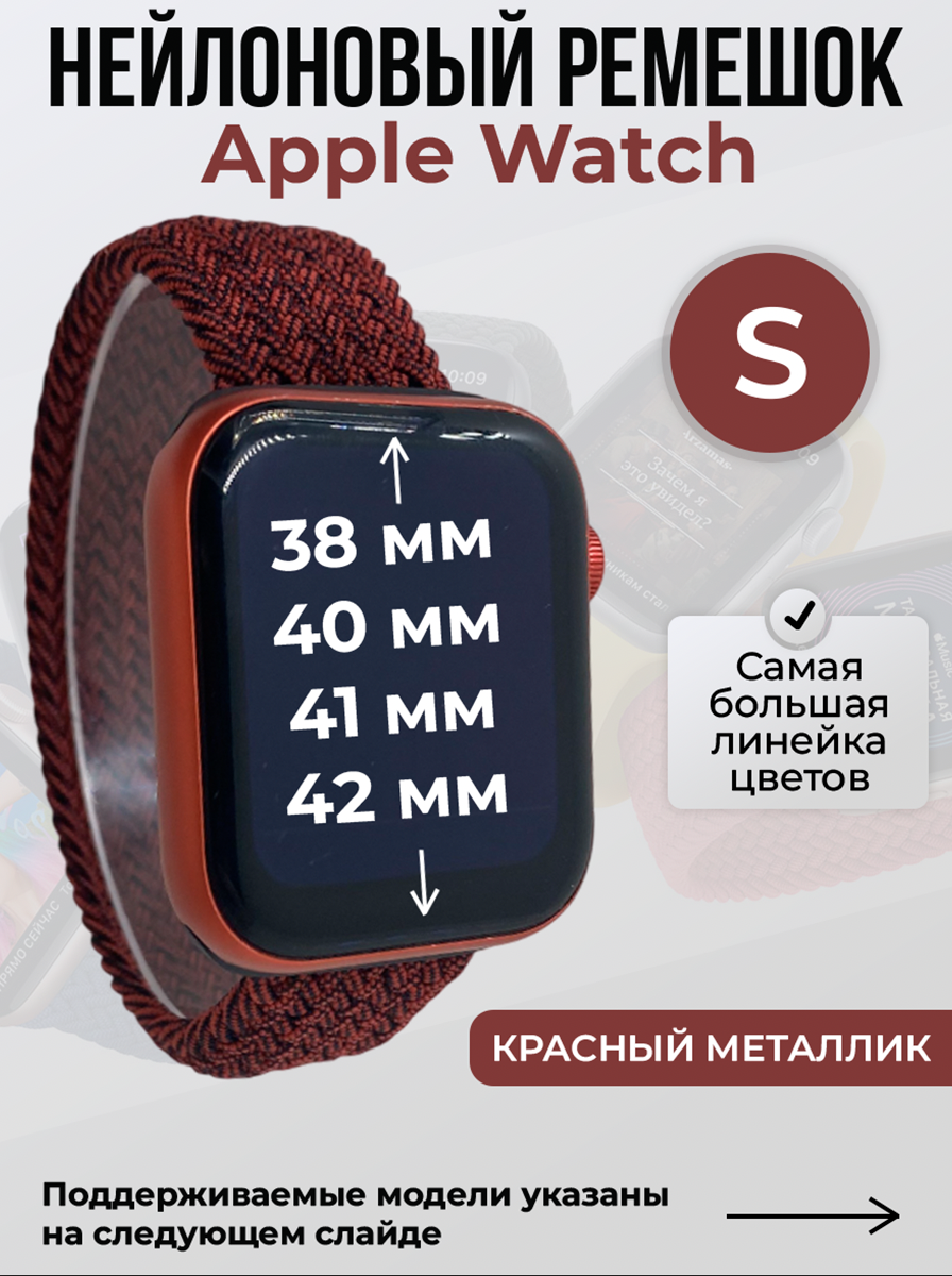 Нейлоновый ремешок для Apple Watch 1-9/SE/SE2/SE3 (38/40/41 мм), 10/11/S10/S11, 42 мм, без застежки, красный металлик, размер S