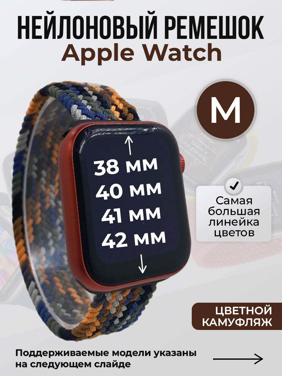 Нейлоновый ремешок для Apple Watch 1-9/SE/SE2/SE3 (38/40/41 мм), 10/11/S10/S11, 42 мм, без застежки, цветной камуфляж, размер M