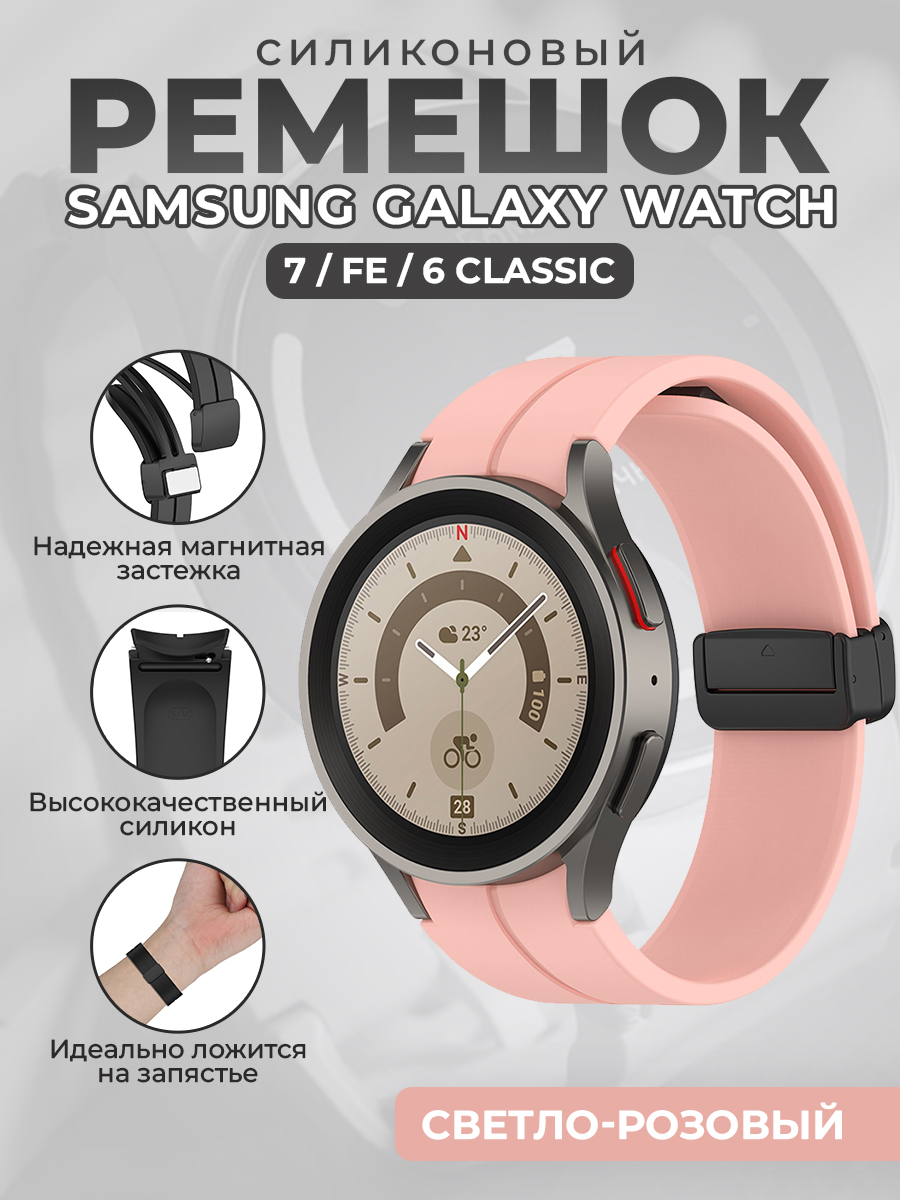 Силиконовый ремешок для Samsung Galaxy Watch 7 / FE / 6 Classic, с черной магнитной застежкой, светло-розовый