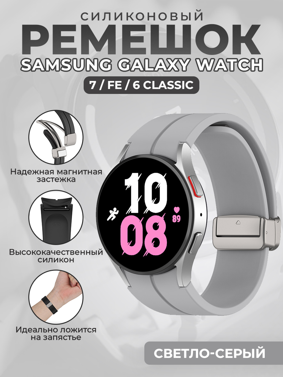 Силиконовый ремешок для Samsung Galaxy Watch 7 / FE / 6 Classic, с серебристой магнитной застежкой, светло-серый