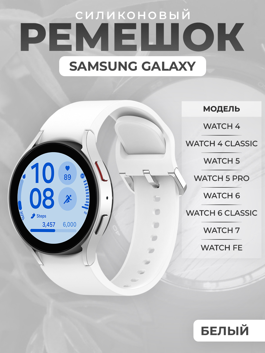 Силиконовый ремешок для Samsung Galaxy Watch 7 / FE / 6 Classic, с серебристой застежкой, белый