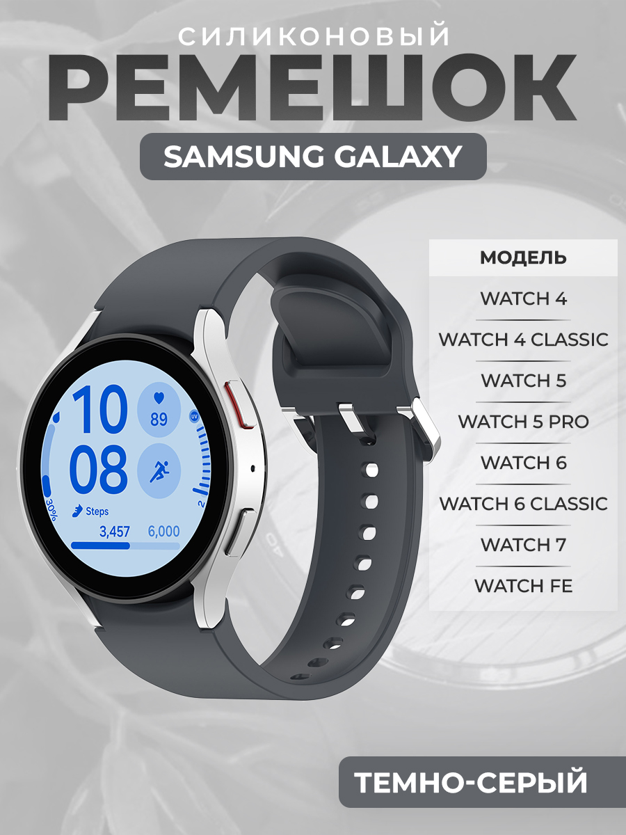 Силиконовый ремешок для Samsung Galaxy Watch 7 / FE / 6 Classic, с серебристой застежкой, темно-серый