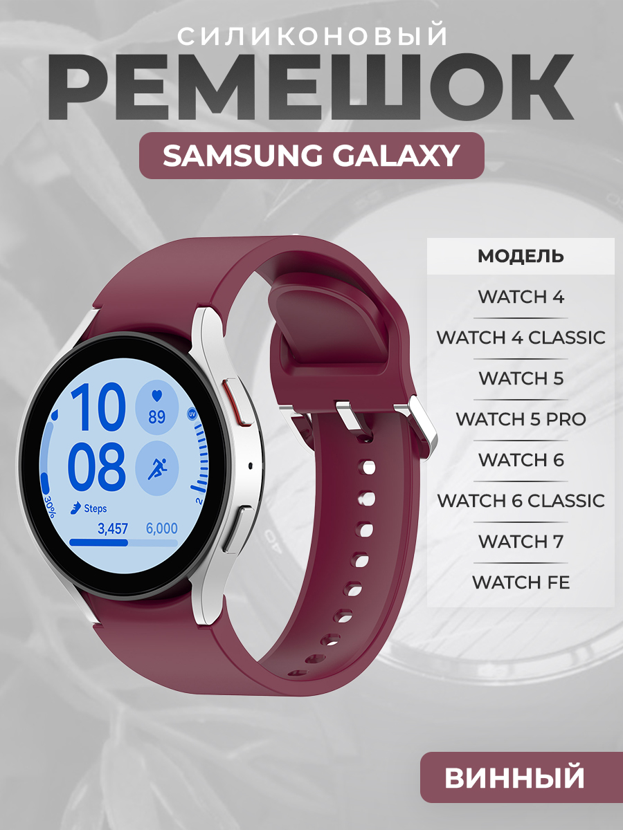 Силиконовый ремешок для Samsung Galaxy Watch 7 / FE / 6 Classic, с серебристой застежкой, винный