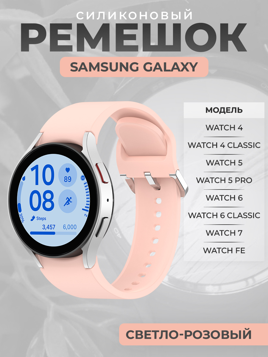 Силиконовый ремешок для Samsung Galaxy Watch 7 / FE / 6 Classic, с серебристой застежкой, светло-розовый