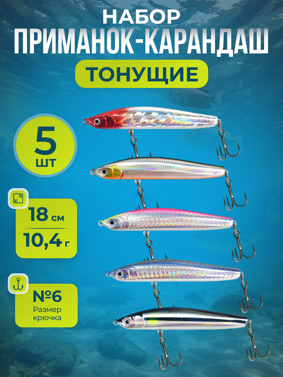 Набор воблеров приманок-карандашей Pencil / Стикбейт (Stickbait), тонущие, с вольфрамовыми бусинами, размером 18 см и весом 10,4 г — это эффективные приманки для ловли активного и осторожного хищника как в пресной, так и в солоноватой воде. Тонущая, длинная, трясущаяся приманка-карандаш с вольфрамовыми бусинами (гравитационный перенос) обеспечивает отличную дальность заброса и стабильное поведение в полёте даже при ветре. Вольфрамовые бусины смещают центр тяжести, создавая выраженную вибрацию и акустический эффект при проводке, что дополнительно привлекает рыбу с большого расстояния. Оснащение включает крючок №6, который оптимально подходит для уверенной подсечки и удержания трофея, а также двойное заводное кольцо 0.7 мм и 4.5 мм. Двойные кольца дают больше свободы в маневренности на 360 градусов, благодаря чему приманка играет более естественно, а рыбе сложнее вырвать крючок из пасти во время вываживания. Данный воблер отлично подходит для ловли щуки, крупного окуня, судака, жереха, а также морского хищника при соответствующих условиях. За счёт тонущей конструкции минимальная глубина работы составляет около 0,5 метра сразу после начала проводки, что позволяет облавливать приповерхностные слои воды. Максимальная глубина зависит от времени свободного погружения и скорости проводки и может достигать 2–4 метров, а при ступенчатой или паузной анимации — до 5 метров. Приманка одинаково хорошо работает на равномерной, рывковой и ступенчатой проводке, имитируя раненую или убегающую добычу. Этот воблер-карандаш станет отличным выбором для рыболовов, которым важны дальний заброс, реалистичная игра и высокая результативность при охоте за крупным хищником.