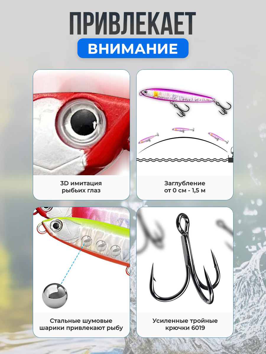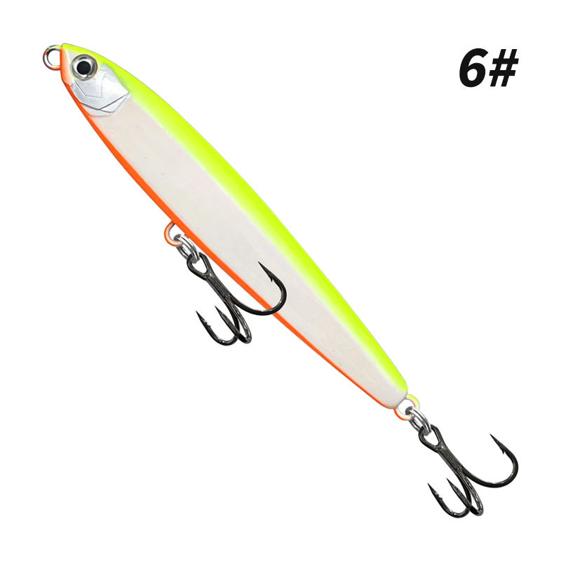 Воблер приманка-карандаш Pencil / Стикбейт (Stickbait) для дальнего заброса длиной 8,1 см и весом 14 г — это эффективная твердая рыболовная приманка, разработанная для активного поиска хищной рыбы на больших акваториях. Благодаря увеличенному весу и продуманной аэродинамике воблер отлично подходит для дальнего и точного заброса, позволяя облавливать удаленные перспективные точки. Конструкция приманки дополнена встроенными погремушками, которые создают акустические колебания и привлекают хищника даже в мутной воде или при слабой видимости. Тройные крючки №8 обеспечивают надежную подсечку и удержание рыбы, а двойное заводное кольцо размером 0,7 мм и 4,5 мм повышает прочность оснастки. Двойные кольца дают больше свободы в маневренности на 360 градусов, из-за чего рыбе значительно сложнее вырвать крючок из пасти во время вываживания. Приманка выполнена в виде твердого воблера-карандаша, который заполняет всю поверхность воды, не имеет чешуи и имитирует вытянутое тело кормовой рыбки. Дополнительную реалистичность придает 3D имитация рыбьего глаза, усиливающая визуальную атаку хищника. Данный воблер отлично подходит для ловли таких видов рыбы, как щука, жерех, крупный окунь, судак, а также морской и пресноводный хищник, охотящийся в верхних и средних слоях воды. В зависимости от проводки и условий ловли приманка может работать в широком диапазоне глубин: минимально воблер находится практически у поверхности — от 0–10 см, что делает его эффективным при поверхностной и быстрой проводке, а максимально может заглубляться примерно до 0,8–1,5 м при паузах, более медленной проводке или на течении. Такой воблер-карандаш станет универсальным выбором для активной рыбалки, сочетая дальнобойность, высокую заметность и надежную реализацию поклевок.
