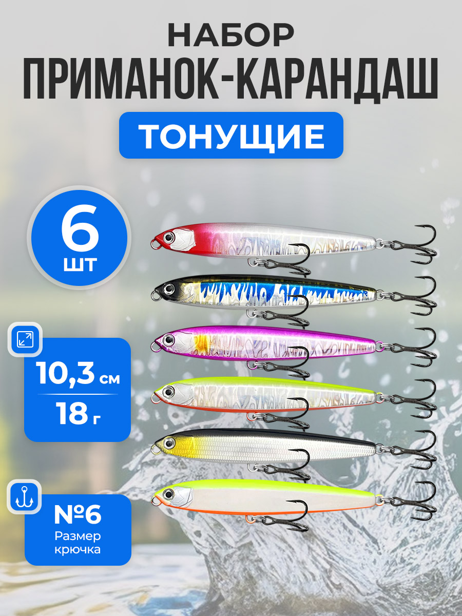 Набор воблеров приманок-карандаш Pencil / Стикбейт (Stickbait) для дальнего заброса длиной 10,3 см и весом 18 г — это эффективная твердая приманка, предназначенная для активной ловли хищной рыбы на больших акваториях. Приманка оснащена погремушками, которые создают акустические колебания и дополнительно привлекают хищника с дальних дистанций, даже в мутной воде или при слабой видимости. Тело воблера выполнено без чешуи, с гладкой поверхностью, что усиливает гидродинамику и позволяет заполнять всю поверхность воды при проводке. Реалистичная 3D имитация рыбьего глаза служит визуальным раздражителем и провоцирует хищника на атаку. Воблер оснащен тройными крючками №6, которые обеспечивают надежную подсечку и удержание рыбы. Двойное заводное кольцо 0.7 мм и 4.5 мм дает приманке больше свободы в маневренности на 360 градусов, благодаря чему воблер естественно играет на рывковой и равномерной проводке, а рыбе значительно сложнее вырвать крючок из пасти во время сопротивления. Такая приманка отлично подходит для ловли щуки, жереха, судака, крупного окуня, а также может быть эффективна по сому и морскому хищнику при соответствующих условиях. Воблер рассчитан на дальний заброс и стабильно летит даже при ветре, что делает его удобным для береговой ловли. По глубине работы приманка относится к поверхностным и при стандартной проводке находится на минимальной глубине около 0–5 см от поверхности воды. При более активной рывковой проводке, ускорении или на течении воблер может кратковременно уходить на максимальную глубину до 20–40 см, после чего снова поднимается к поверхности. Такой диапазон делает приманку особенно эффективной при ловле хищника, охотящегося в верхних слоях воды.
