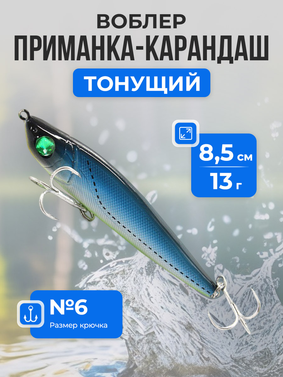 Воблер приманка-карандаш Pencil / Стикбейт (Stickbait) твердая, качающаяся, тонущая 8,5 см/13 г — это универсальная и эффективная приманка для спиннинговой ловли хищной рыбы в различных условиях. Данный воблер относится к классу S (Sinking) — тонущий, что позволяет уверенно контролировать глубину проводки и облавливать как поверхностные, так и более глубокие слои воды. Компактная длина 8,5 см и оптимальный вес 13 г обеспечивают отличные полетные характеристики, стабильность при дальнем забросе и точность попадания в перспективные точки ловли. Твердый корпус приманки выполнен в форме классического карандаша без лопасти, благодаря чему воблер демонстрирует выразительную качающуюся игру с боковыми отклонениями, имитируя раненую или дезориентированную рыбку. Такая анимация особенно привлекательна для щуки, судака, жереха, окуня, а также может эффективно работать по голавлю и морскому хищнику в прибрежной зоне. Оснащение крючком №6 обеспечивает надежную подсечку и удержание рыбы во время вываживания. Тонущая конструкция позволяет использовать воблер на минимальной глубине около 0,3–0,5 метра при быстрой проводке, а при паузах и замедленной анимации приманка может опускаться на глубину до 2–3 метров, в зависимости от силы течения и скорости подмотки. Воблер Pencil / Stickbait отлично подходит для равномерной, твичинговой и рывковой проводки, эффективно работает на реках, озерах, водохранилищах и в прибрежных морских зонах. Это надежный выбор для рыболовов, которые ценят дальний заброс, реалистичную игру и универсальность одной приманки в разных условиях ловли.