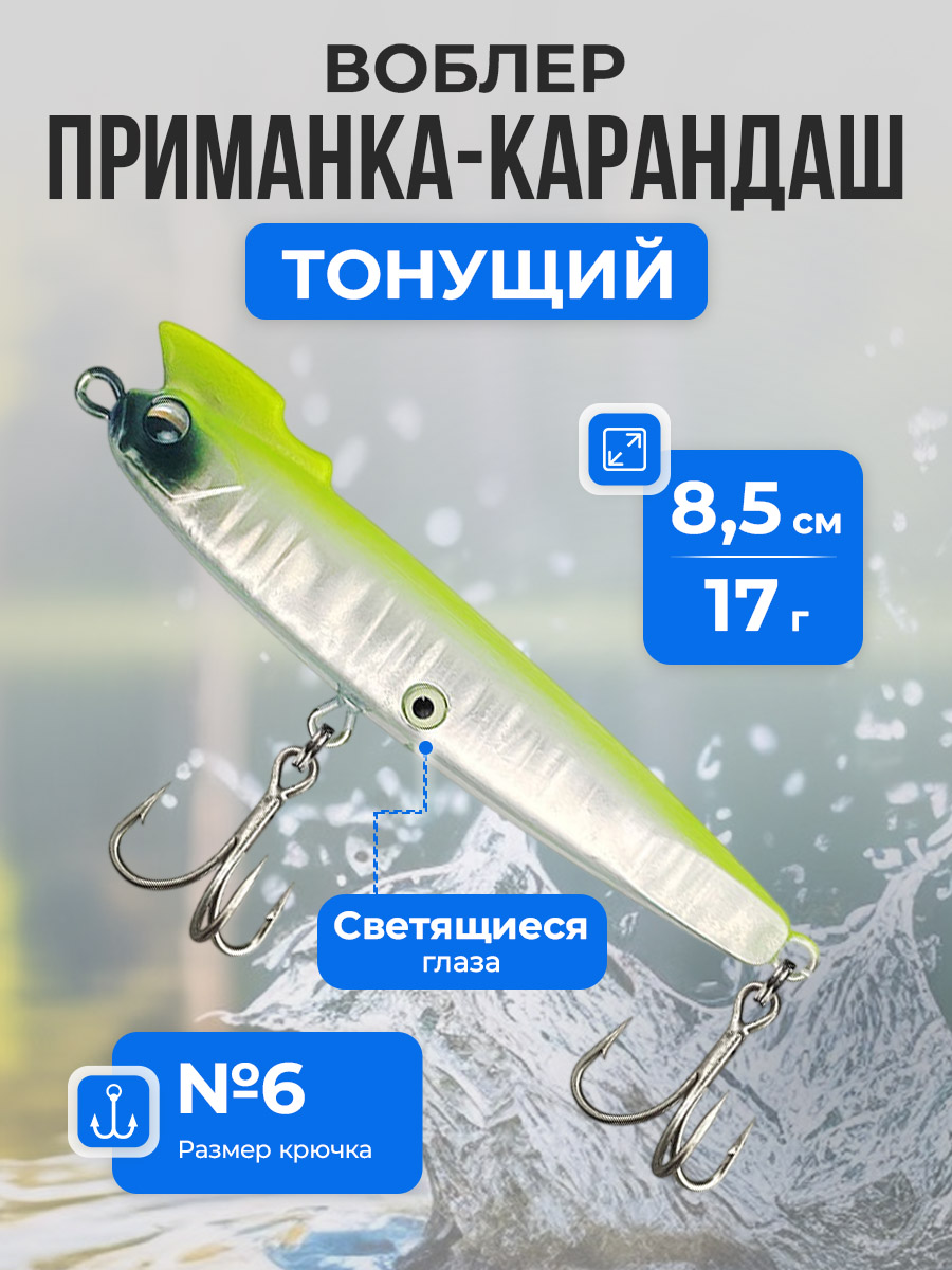 Воблер приманка-карандаш Pencil / Стикбейт (Stickbait) тонущая, твердая для дальнего заброса 8,5 см/17 г — это универсальная и высокоэффективная рыболовная приманка в форме карандаша, разработанная для активной ловли хищной рыбы как в пресной, так и в морской воде. Тонущая рыболовная приманка имеет класс плавучести S (Sinking) — тонущий, что позволяет ей быстро достигать рабочей глубины и стабильно удерживаться в нужном горизонте проводки. Благодаря вытянутой форме и оптимальному весу 17 г воблер обеспечивает отличный дальний заброс даже при встречном ветре и точно летит к перспективной точке. Особенностью модели является гребешок на голове в виде острой курицы, которая повышает реалистичность игры и надежность засечки хищника. Жесткая конструкция и сбалансированная геометрия создают характерную качающуюся игру при равномерной, рывковой или ступенчатой проводке, имитируя раненую рыбку. Оснащение включает крючок №6, который надежно засекает рыбу и удерживает ее во время вываживания. Приманка оснащена двумя парами 3D имитации рыбьего глаза: одна пара расположена на голове, вторая — снизу на животе, при этом глаза на животе люминесцентные и светятся в темноте, что значительно повышает заметность воблера в мутной воде и при слабом освещении. Воблер отлично подходит для ловли щуки, судака, окуня, жереха, форели, а в морской воде — для ставриды, луфаря и другого прибрежного хищника. Минимальная рабочая глубина составляет около 0,5 метра при начале проводки, максимальная глубина может достигать 3–4 метров в зависимости от скорости проводки и паузы. Воблер приманка-карандаш идеально подходит для активного поиска рыбы на больших акваториях, прибрежных зонах, перекатах и свалах, обеспечивая стабильные поклевки и уверенную игру в любых условиях ловли.