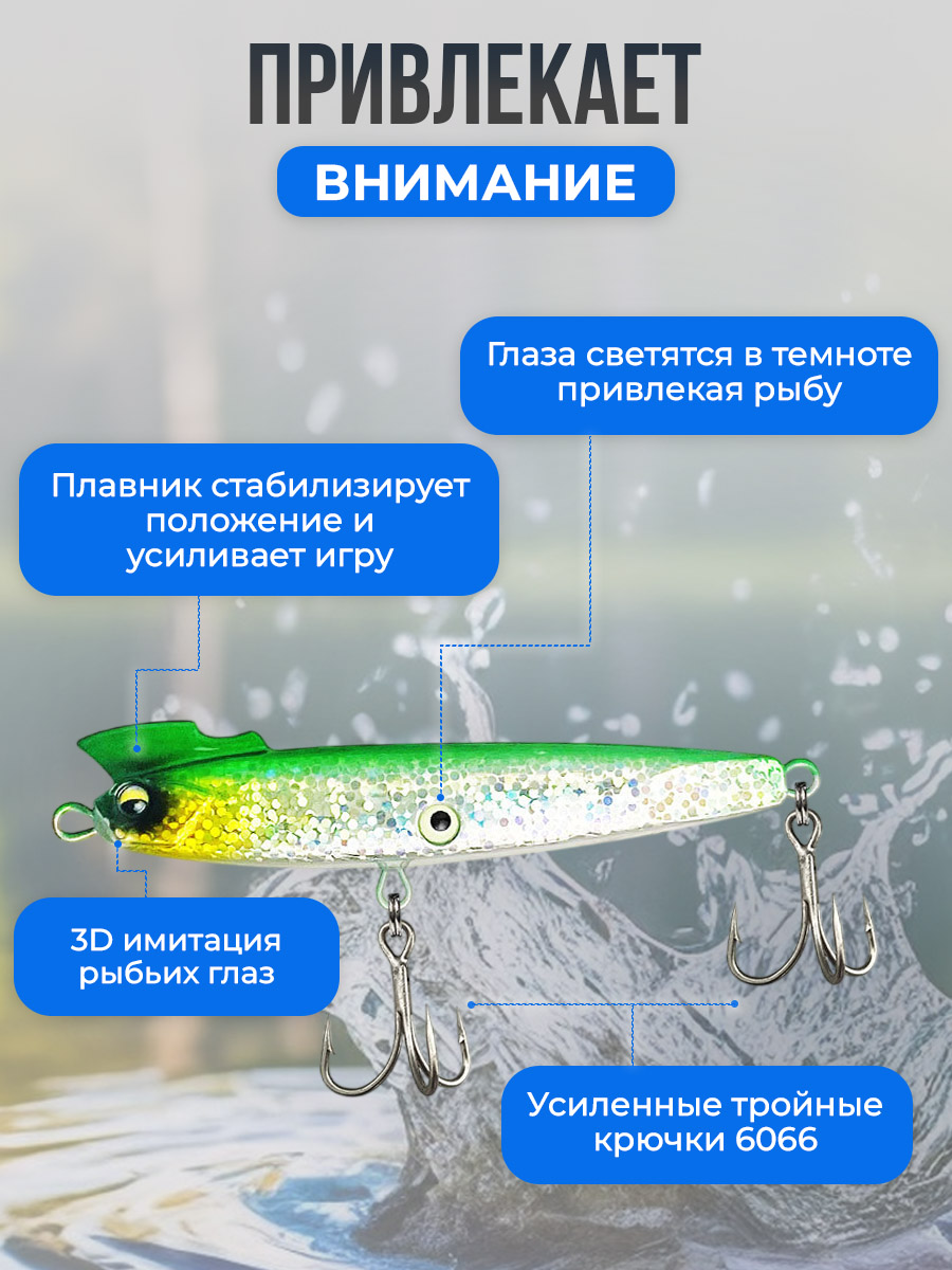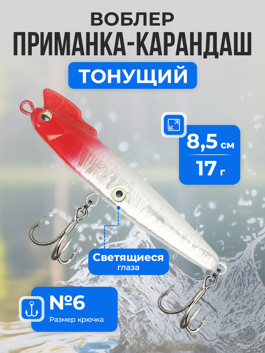 Воблер приманка-карандаш Pencil / Стикбейт (Stickbait) тонущая, твердая для дальнего заброса 8,5 см/17 г — это универсальная и высокоэффективная рыболовная приманка в форме карандаша, разработанная для активной ловли хищной рыбы как в пресной, так и в морской воде. Тонущая рыболовная приманка имеет класс плавучести S (Sinking) — тонущий, что позволяет ей быстро достигать рабочей глубины и стабильно удерживаться в нужном горизонте проводки. Благодаря вытянутой форме и оптимальному весу 17 г воблер обеспечивает отличный дальний заброс даже при встречном ветре и точно летит к перспективной точке. Особенностью модели является гребешок на голове в виде острой курицы, которая повышает реалистичность игры и надежность засечки хищника. Жесткая конструкция и сбалансированная геометрия создают характерную качающуюся игру при равномерной, рывковой или ступенчатой проводке, имитируя раненую рыбку. Оснащение включает крючок №6, который надежно засекает рыбу и удерживает ее во время вываживания. Приманка оснащена двумя парами 3D имитации рыбьего глаза: одна пара расположена на голове, вторая — снизу на животе, при этом глаза на животе люминесцентные и светятся в темноте, что значительно повышает заметность воблера в мутной воде и при слабом освещении. Воблер отлично подходит для ловли щуки, судака, окуня, жереха, форели, а в морской воде — для ставриды, луфаря и другого прибрежного хищника. Минимальная рабочая глубина составляет около 0,5 метра при начале проводки, максимальная глубина может достигать 3–4 метров в зависимости от скорости проводки и паузы. Воблер приманка-карандаш идеально подходит для активного поиска рыбы на больших акваториях, прибрежных зонах, перекатах и свалах, обеспечивая стабильные поклевки и уверенную игру в любых условиях ловли.
