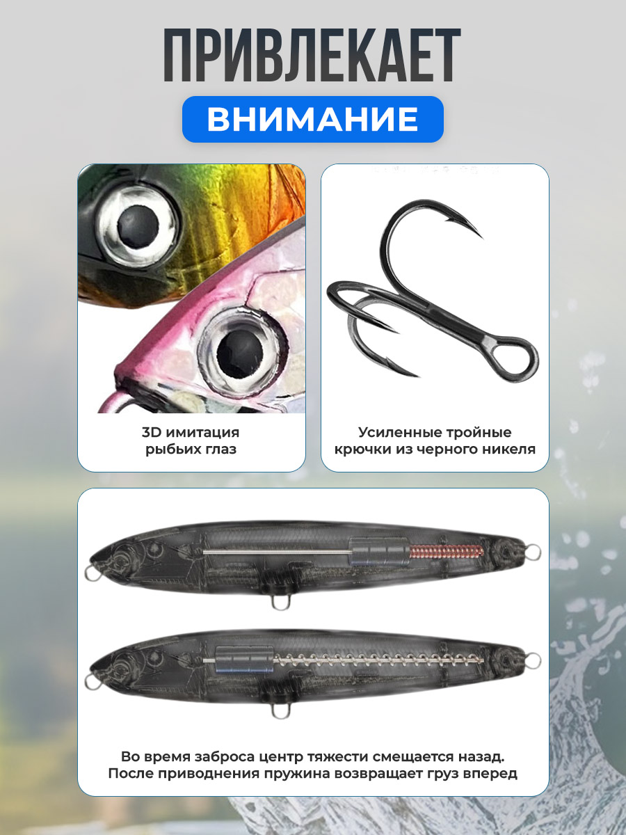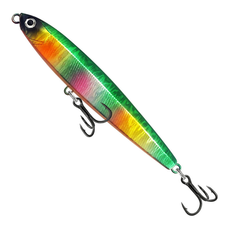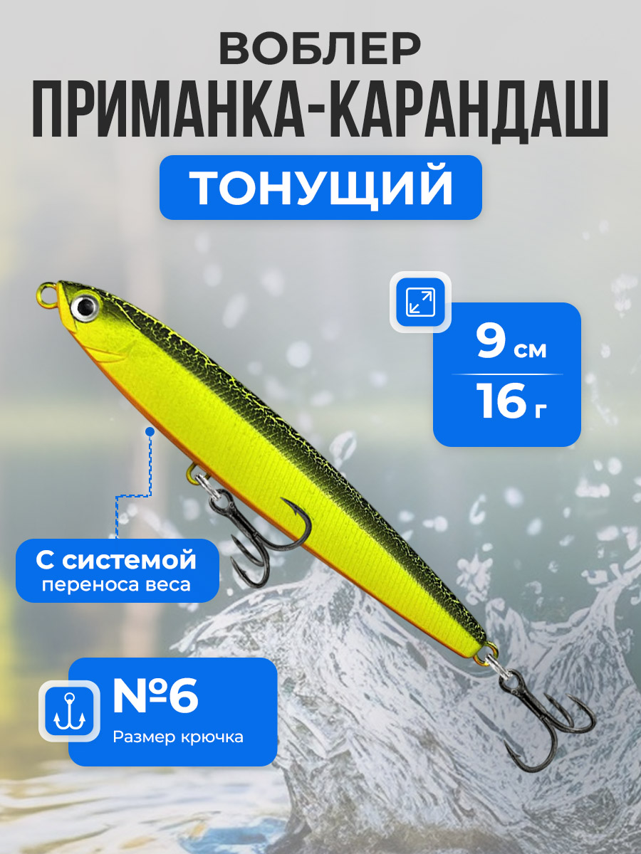 Воблер-приманка Pencil / Стикбейт (Stickbait) длиной 9 см и весом 16 г представляет собой идеальный инструмент для рыболовов, стремящихся к дальним забросам и высокой результативности на ловле хищной рыбы. Этот воблер-карандаш тонущий S (Sinking) обладает жесткой конструкцией и оснащён системой мертвой мушки, благодаря чему приманка демонстрирует максимально естественную игру даже при остановке проводки. Для обеспечения дальнего заброса модель оборудована системой переноса центра тяжести: во время полёта утяжелитель смещается по центральному стержню к хвостовой части приманки, а после приводнения или при остановке движения пружина мгновенно возвращает груз в исходное положение, создавая стабильную и привлекательную для рыбы игру. Воблер оснащён прочным двойным кольцом острым крючком №6 из нержавеющей стали, что гарантирует надёжность при поимке активного хищника. 3D имитация рыбьего глаза повышает реалистичность приманки и привлекает внимание щуки, судака, окуня и других хищных видов рыбы. Модель маркирована как Pencil Stickbait 9см/16г и предназначена для ловли на глубине от 0,3 до 1,5 м, что делает её универсальной для прибрежной зоны и открытой воды. Воблер стабильно держит курс на течении и в стоячей воде, подходит для твичинговой, ступенчатой и равномерной проводки, а его реалистичная игра и дальний заброс позволяют эффективно привлекать рыбу в различных условиях. Pencil / Stickbait станет незаменимым выбором для активной рыбалки, обеспечивая уверенные поклёвки и впечатляющие уловы, сочетая долговечность, высокую функциональность и привлекательный внешний вид. Эта приманка идеально подходит как для опытных рыболовов, так и для начинающих, желающих увеличить результативность своих рыбалок.