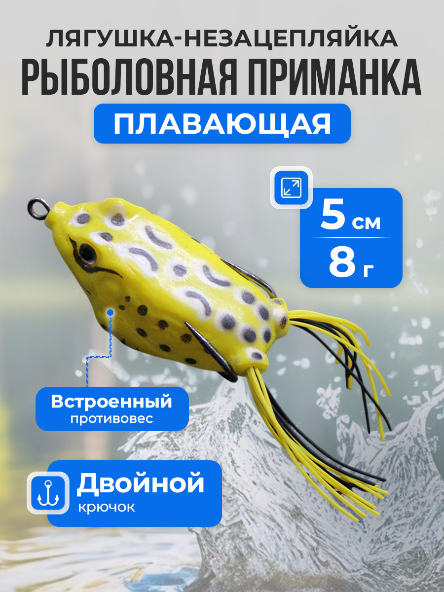 Рыболовная приманка Frog bait / Topwater Frog — это высокоэффективная поверхностная приманка, выполненная в виде реалистичной имитации лягушки и предназначенная для ловли хищной рыбы в заросших и труднодоступных местах. Длина приманки составляет 5 см, вес — 8 г, что обеспечивает хороший баланс между дальностью и точностью заброса, а также стабильную работу при поверхностной проводке. Маркировка F (Floating) указывает на полностью плавающий тип приманки, работающей в самом верхнем слое воды. Фрог оснащён прочными двойными крючками из нержавеющей стали, плотно прижатыми к корпусу, благодаря чему приманка обладает выраженными незацепляющимися свойствами и уверенно проходит через водную растительность, кувшинки, камыш и коряжник. Реалистичная 3D-имитация рыбьего глаза усиливает визуальную привлекательность приманки и повышает количество результативных атак со стороны хищника. При проводке приманка создаёт характерные колебания и всплески, точно имитируя движения живой лягушки на поверхности воды, что особенно эффективно в тёплое время года. Основное назначение данной приманки — ловля щуки, басса, змееголова, крупного окуня и других засадных хищников, охотящихся у поверхности и в прибрежной зоне. Минимальная рабочая глубина составляет 0 см — приманка движется непосредственно по поверхности воды, максимальная глубина — до 5 см при остановках или активной анимации. Frog bait является отличным выбором для поверхностной ловли, позволяя успешно облавливать участки, недоступные для классических воблеров и блёсен, и добиваться стабильных результатов даже в сложных условиях.