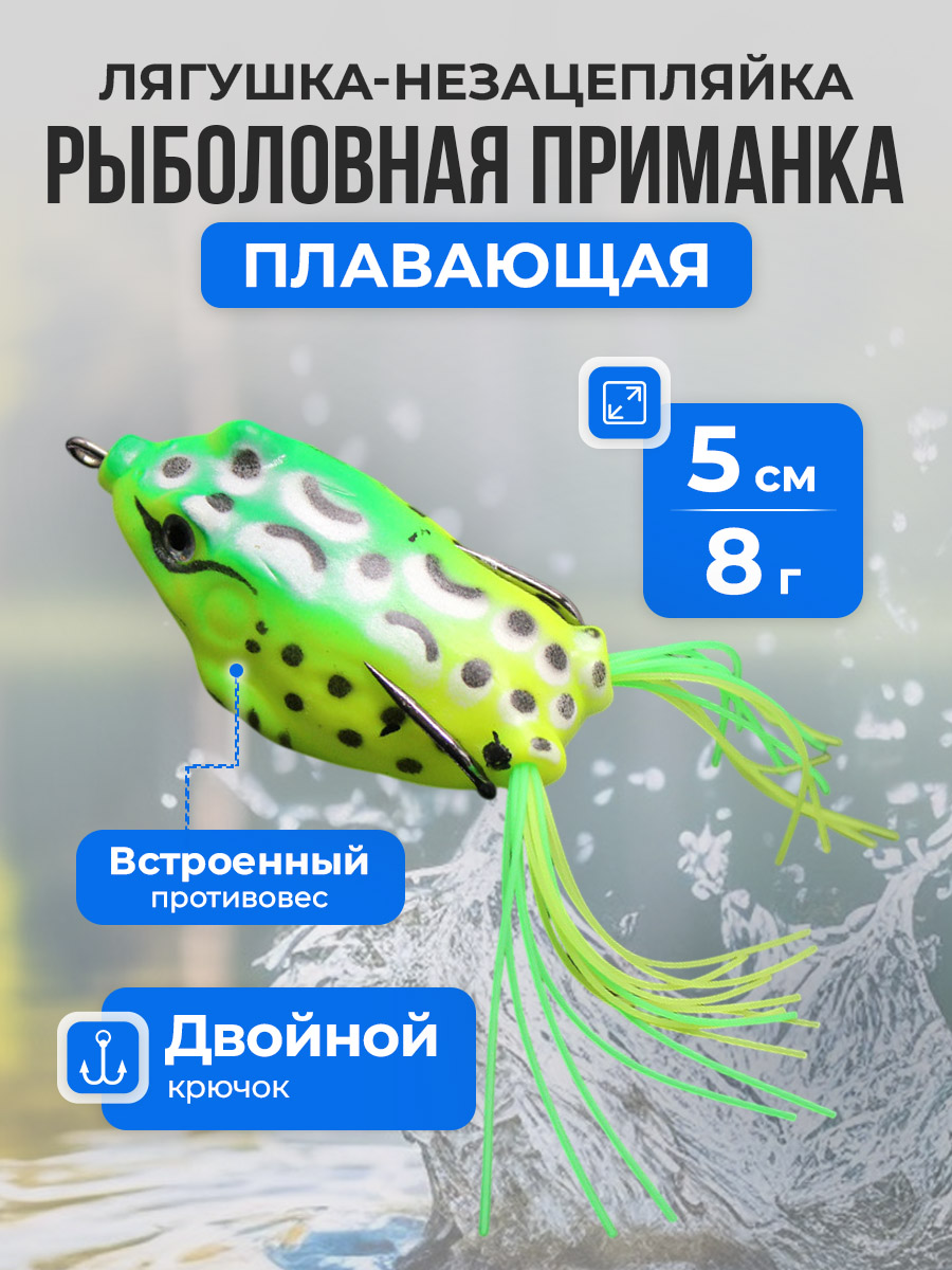 Рыболовная приманка Frog bait / Topwater Frog — это высокоэффективная поверхностная приманка, выполненная в виде реалистичной имитации лягушки и предназначенная для ловли хищной рыбы в заросших и труднодоступных местах. Длина приманки составляет 5 см, вес — 8 г, что обеспечивает хороший баланс между дальностью и точностью заброса, а также стабильную работу при поверхностной проводке. Маркировка F (Floating) указывает на полностью плавающий тип приманки, работающей в самом верхнем слое воды. Фрог оснащён прочными двойными крючками из нержавеющей стали, плотно прижатыми к корпусу, благодаря чему приманка обладает выраженными незацепляющимися свойствами и уверенно проходит через водную растительность, кувшинки, камыш и коряжник. Реалистичная 3D-имитация рыбьего глаза усиливает визуальную привлекательность приманки и повышает количество результативных атак со стороны хищника. При проводке приманка создаёт характерные колебания и всплески, точно имитируя движения живой лягушки на поверхности воды, что особенно эффективно в тёплое время года. Основное назначение данной приманки — ловля щуки, басса, змееголова, крупного окуня и других засадных хищников, охотящихся у поверхности и в прибрежной зоне. Минимальная рабочая глубина составляет 0 см — приманка движется непосредственно по поверхности воды, максимальная глубина — до 5 см при остановках или активной анимации. Frog bait является отличным выбором для поверхностной ловли, позволяя успешно облавливать участки, недоступные для классических воблеров и блёсен, и добиваться стабильных результатов даже в сложных условиях.
