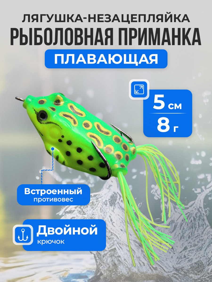 Рыболовная приманка Frog bait / Topwater Frog — это высокоэффективная поверхностная приманка, выполненная в виде реалистичной имитации лягушки и предназначенная для ловли хищной рыбы в заросших и труднодоступных местах. Длина приманки составляет 5 см, вес — 8 г, что обеспечивает хороший баланс между дальностью и точностью заброса, а также стабильную работу при поверхностной проводке. Маркировка F (Floating) указывает на полностью плавающий тип приманки, работающей в самом верхнем слое воды. Фрог оснащён прочными двойными крючками из нержавеющей стали, плотно прижатыми к корпусу, благодаря чему приманка обладает выраженными незацепляющимися свойствами и уверенно проходит через водную растительность, кувшинки, камыш и коряжник. Реалистичная 3D-имитация рыбьего глаза усиливает визуальную привлекательность приманки и повышает количество результативных атак со стороны хищника. При проводке приманка создаёт характерные колебания и всплески, точно имитируя движения живой лягушки на поверхности воды, что особенно эффективно в тёплое время года. Основное назначение данной приманки — ловля щуки, басса, змееголова, крупного окуня и других засадных хищников, охотящихся у поверхности и в прибрежной зоне. Минимальная рабочая глубина составляет 0 см — приманка движется непосредственно по поверхности воды, максимальная глубина — до 5 см при остановках или активной анимации. Frog bait является отличным выбором для поверхностной ловли, позволяя успешно облавливать участки, недоступные для классических воблеров и блёсен, и добиваться стабильных результатов даже в сложных условиях.