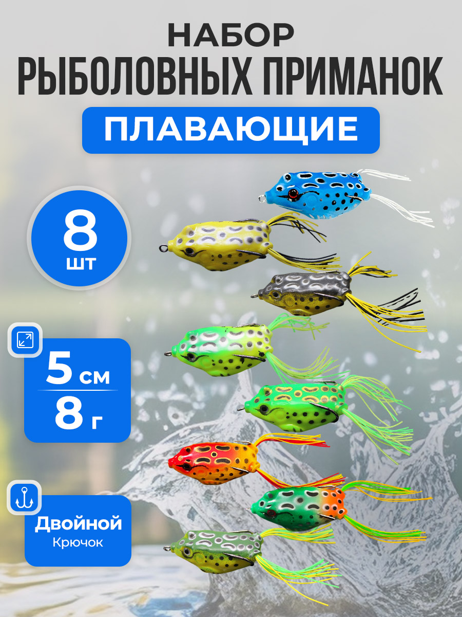 Набор рыболовных приманок, имитация лягушки, Frog bait / Topwater Frog, с крючками 5 см/8 г, 8 шт, разноцветные