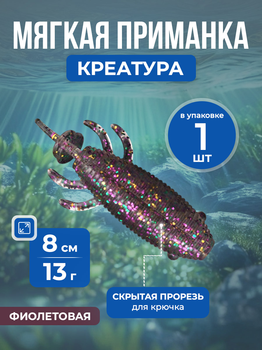 Рыболовная плавающая, мягкая приманка-червяк Creature Bait, 8 см/13 г, 1 шт, фиолетовая
