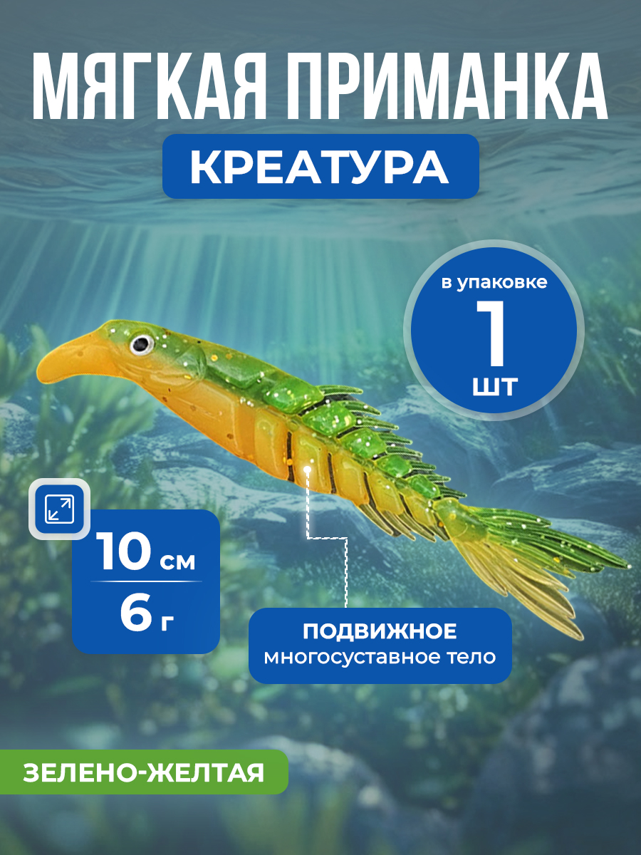 Рыболовная двухцветная, мягкая приманка Creature Bait, имитация многосуставной кости с хвостом-ножницами, 10 см/6 г, 1 шт, зелено-желтая