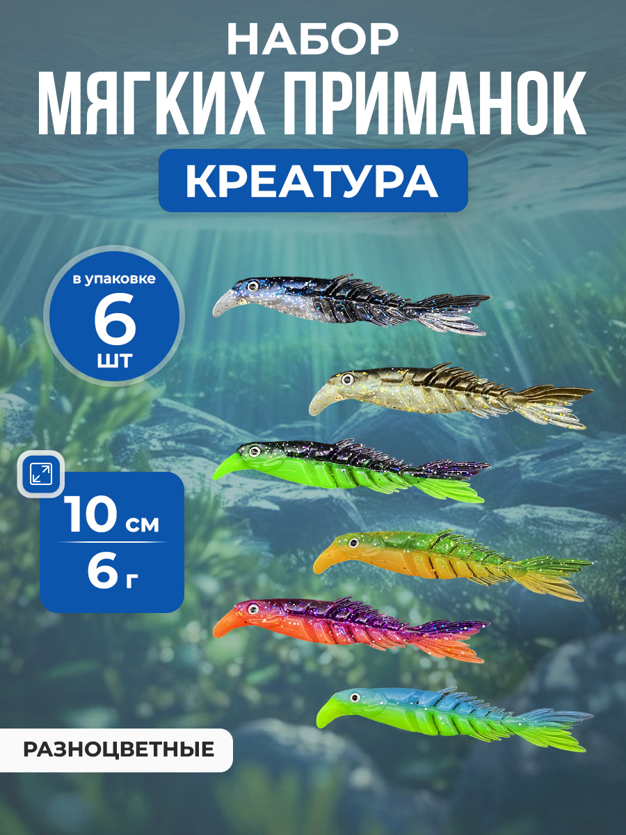 Набор рыболовных двухцветных, мягких приманок Creature Bait, имитация многосуставной кости с хвостом-ножницами, 10 см/6 г, 6 шт, разноцветные