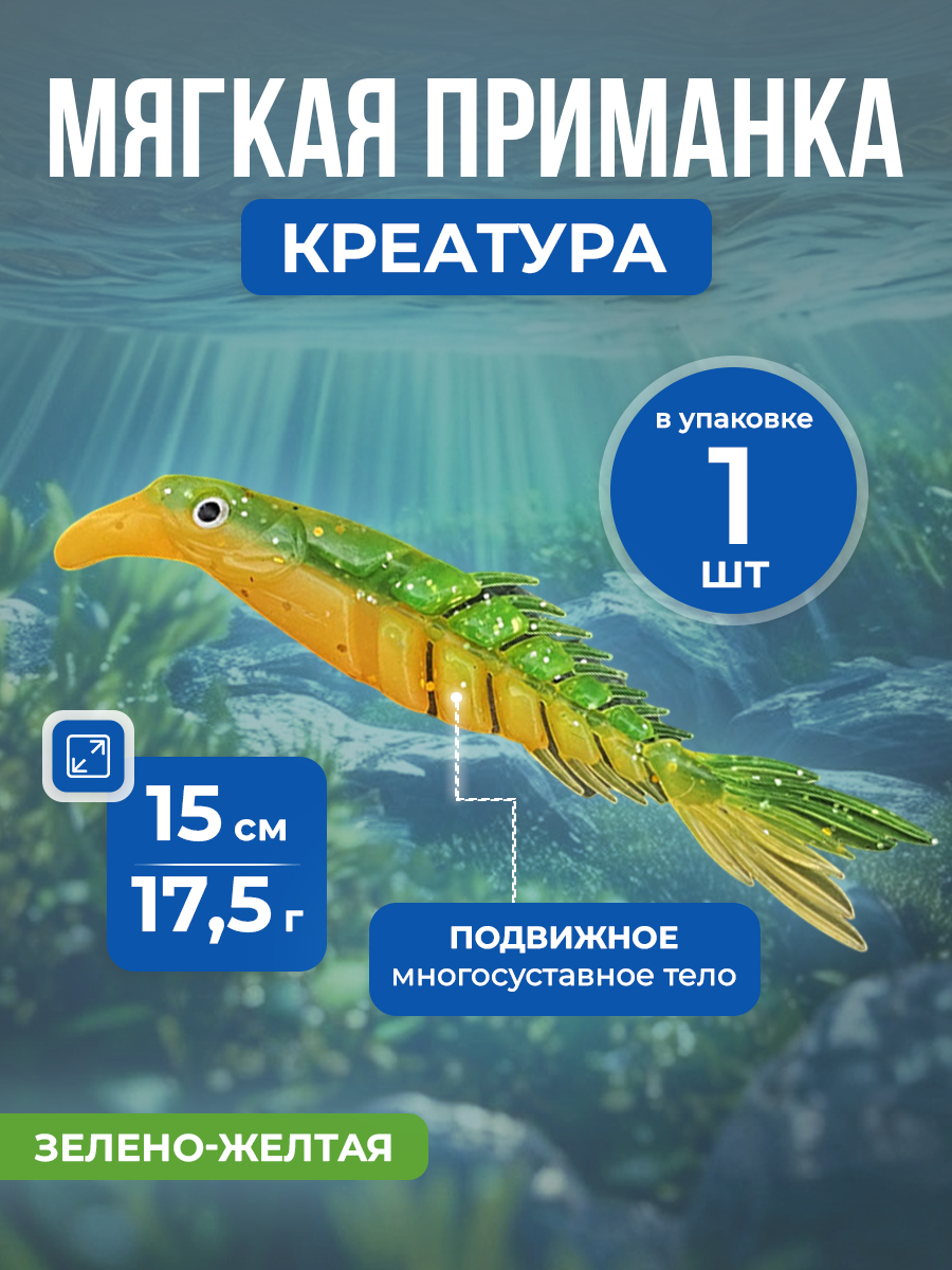Рыболовная двухцветная, мягкая приманка Creature Bait, имитация многосуставной кости с хвостом-ножницами, 15 см/17.5 г, 1 шт, зелено-желтая