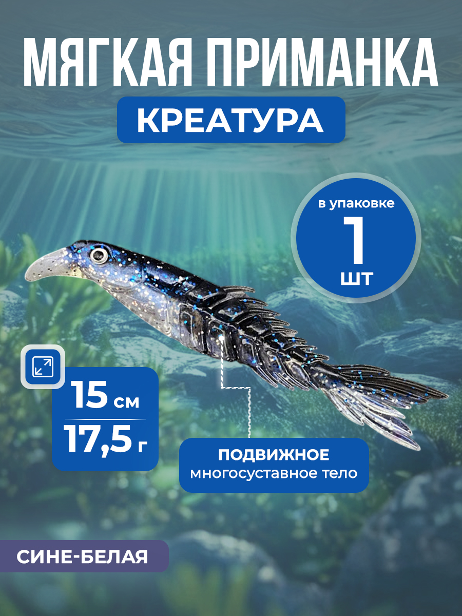 Рыболовная двухцветная, мягкая приманка Creature Bait, имитация многосуставной кости с хвостом-ножницами, 15 см/17.5 г, 1 шт, сине-белая