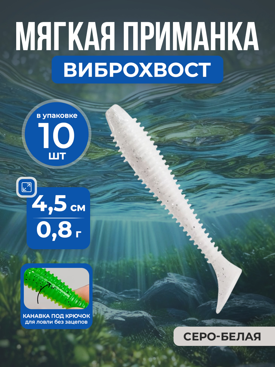 Рыболовная мягкая приманка Swimbait / Paddle T-Tail Grub с Т-образным хвостом и винтовым креплением для пресноводной и морской рыбалки, 4,5 см/0,8 г, 10 шт, серо-белая