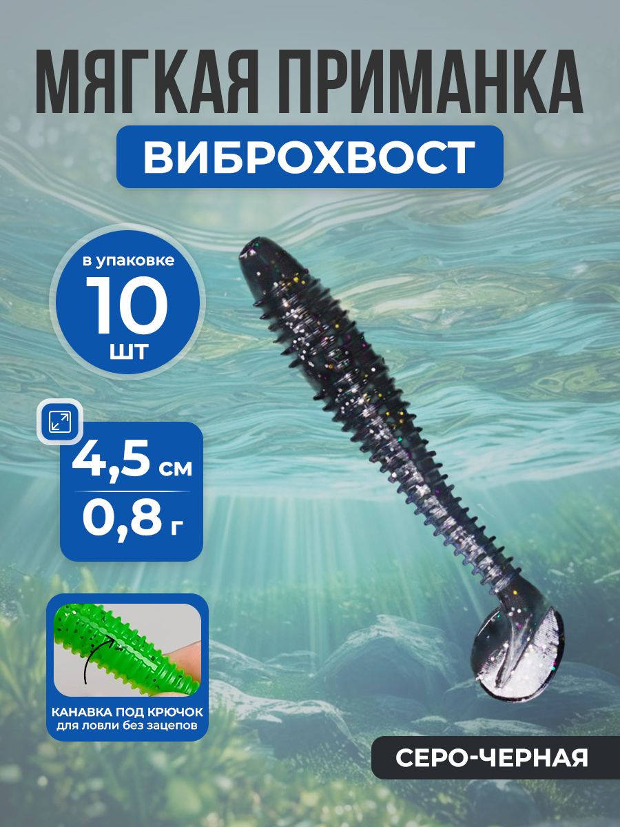 Рыболовная мягкая приманка Swimbait / Paddle T-Tail Grub с Т-образным хвостом и винтовым креплением для пресноводной и морской рыбалки, 4,5 см/0,8 г, 10 шт, серо-черная