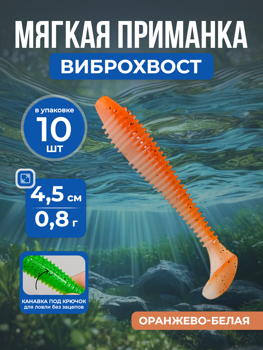 Рыболовная мягкая приманка Swimbait / Paddle T-Tail Grub с Т-образным хвостом и винтовым креплением для пресноводной и морской рыбалки, 4,5 см/0,8 г, 10 шт, оранжево-белая