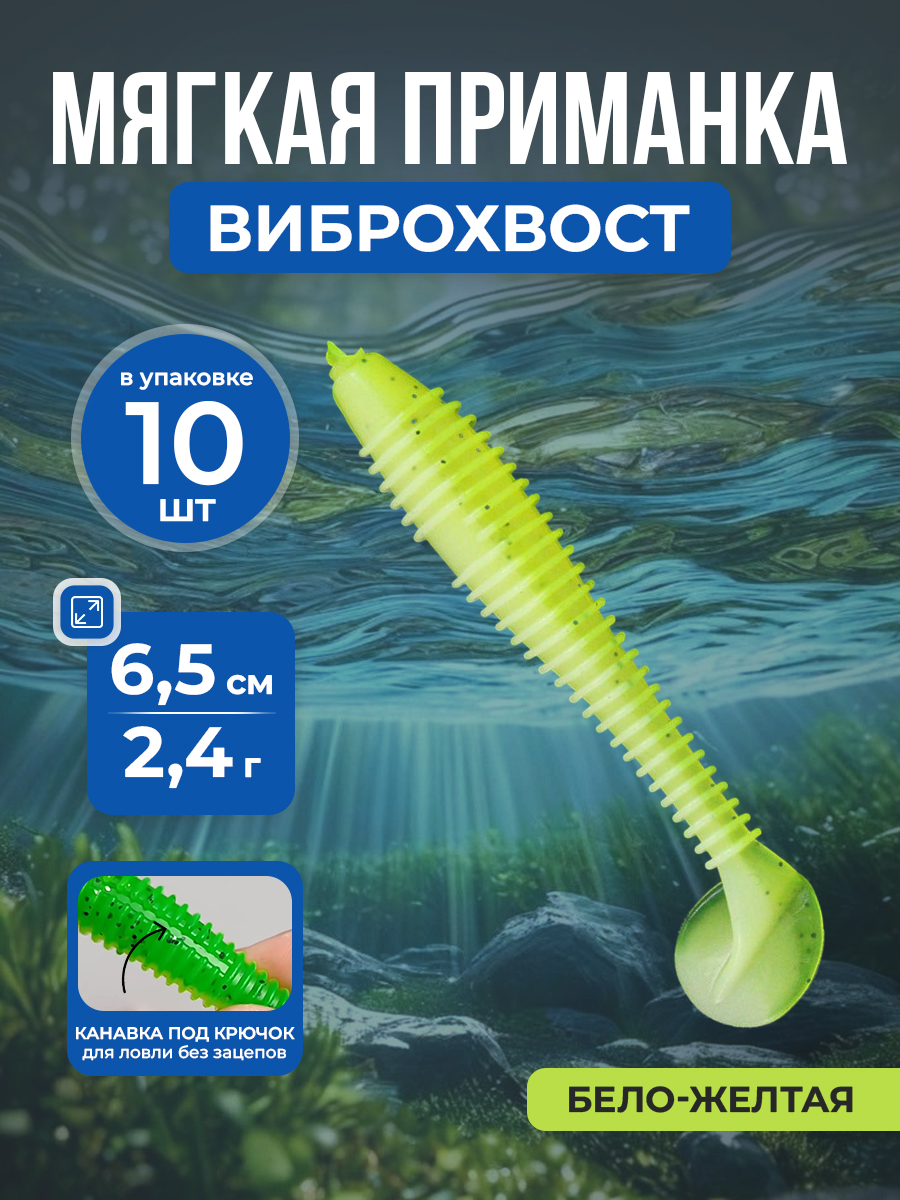 Рыболовная мягкая приманка Swimbait / Paddle T-Tail Grub с Т-образным хвостом и винтовым креплением для пресноводной и морской рыбалки, 6,5 см/2,4 г, 10 шт, бело-желтая