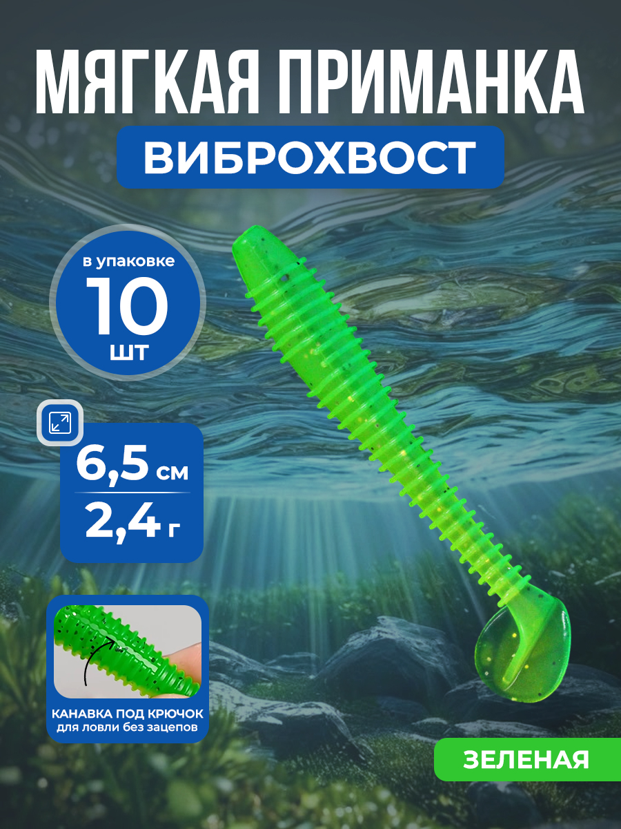 Рыболовная мягкая приманка Swimbait / Paddle T-Tail Grub с Т-образным хвостом и винтовым креплением для пресноводной и морской рыбалки, 6,5 см/2,4 г, 10 шт, зеленая