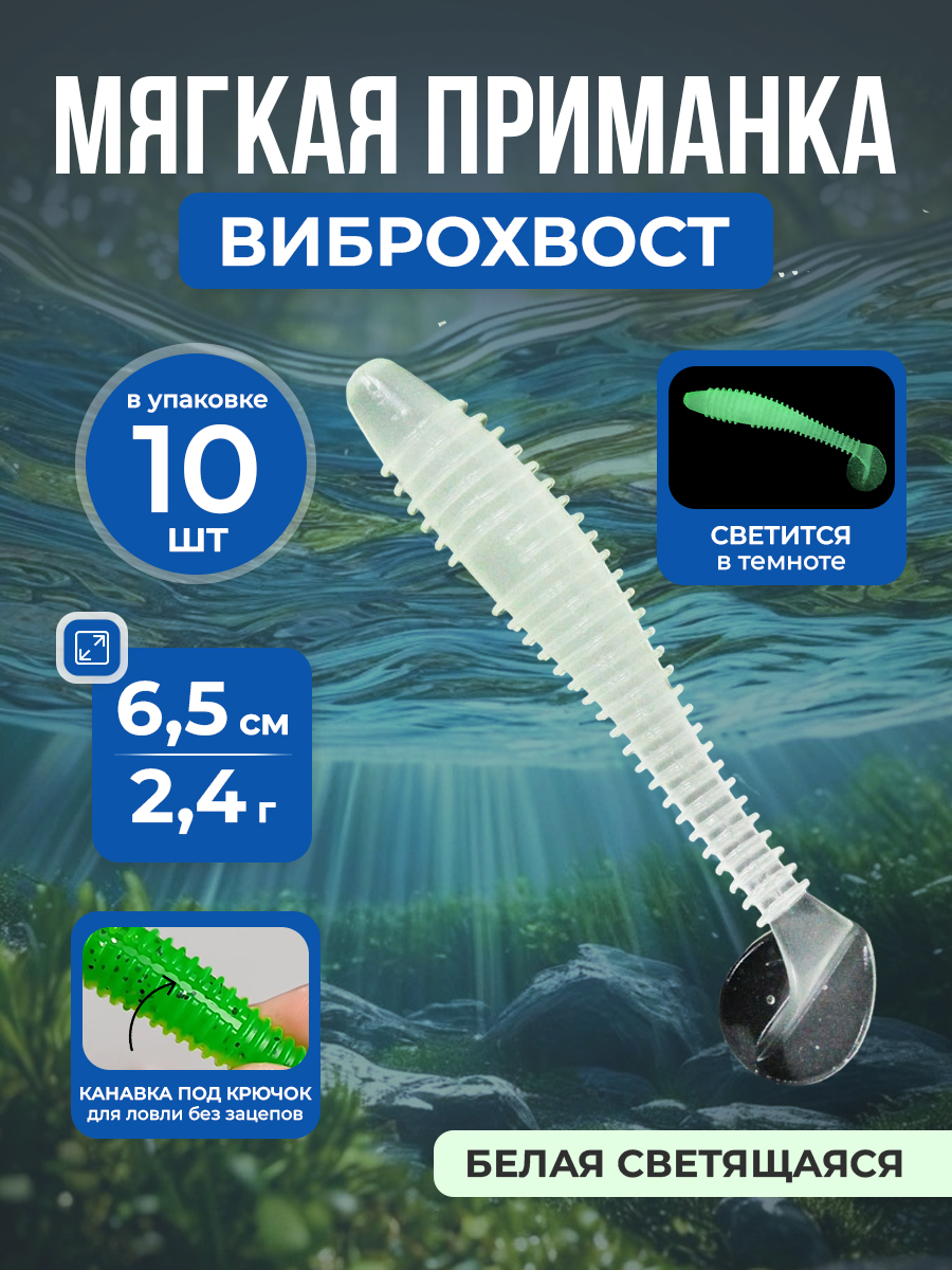 Рыболовная мягкая приманка Swimbait / Paddle T-Tail Grub с Т-образным хвостом и винтовым креплением для пресноводной и морской рыбалки, 6,5 см/2,4 г, 10 шт, белая светящаяся