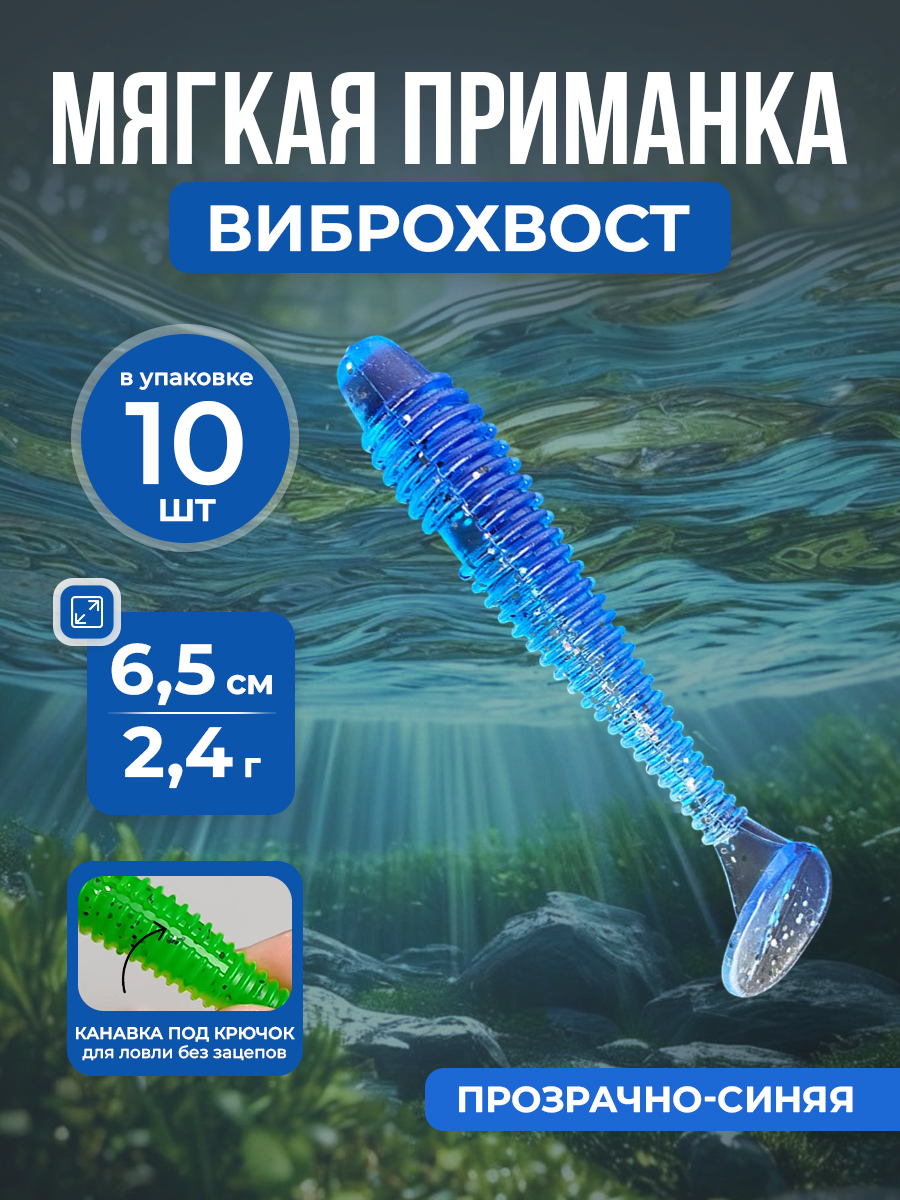 Рыболовная мягкая приманка Swimbait / Paddle T-Tail Grub с Т-образным хвостом и винтовым креплением для пресноводной и морской рыбалки, 6,5 см/2,4 г, 10 шт, прозрачно-синяя