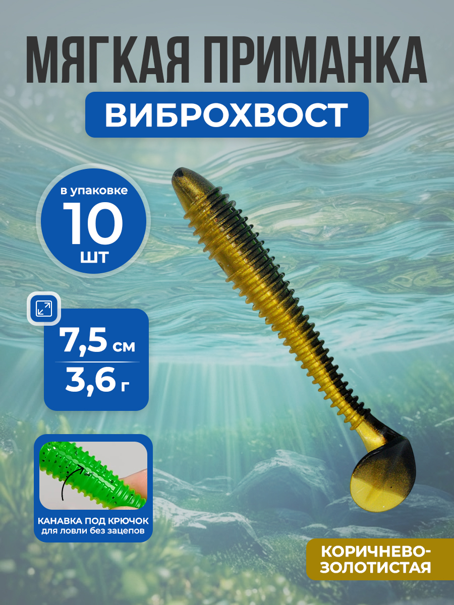 Рыболовная мягкая приманка Swimbait / Paddle T-Tail Grub с Т-образным хвостовым оперением и винтовым рисунком для пресноводной и морской рыбалки, 7,5 см/3,6 г, 10 шт, коричнево-золотистая