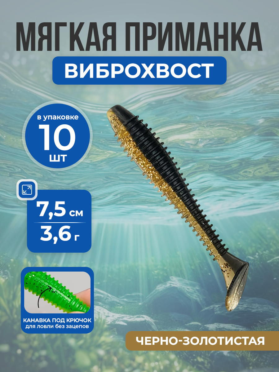 Рыболовная мягкая приманка Swimbait / Paddle T-Tail Grub с Т-образным хвостовым оперением и винтовым рисунком для пресноводной и морской рыбалки, 7,5 см/3,6 г, 10 шт, черно-золотистая