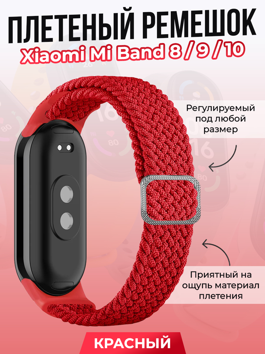 Плетеный ремешок для Xiaomi Mi Band 8/9/10, регулируемый под любой размер, красный