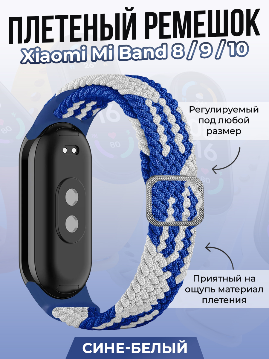 Плетеный ремешок для Xiaomi Mi Band 8/9/10, регулируемый под любой размер, сине-белый