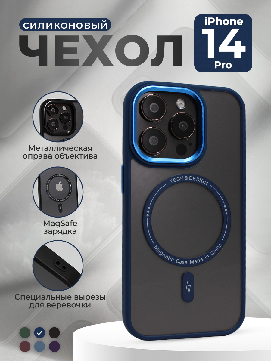 Защитный чехол с металлической оправой объектива для iPhone 14 Pro, MagSafe, темно-синий