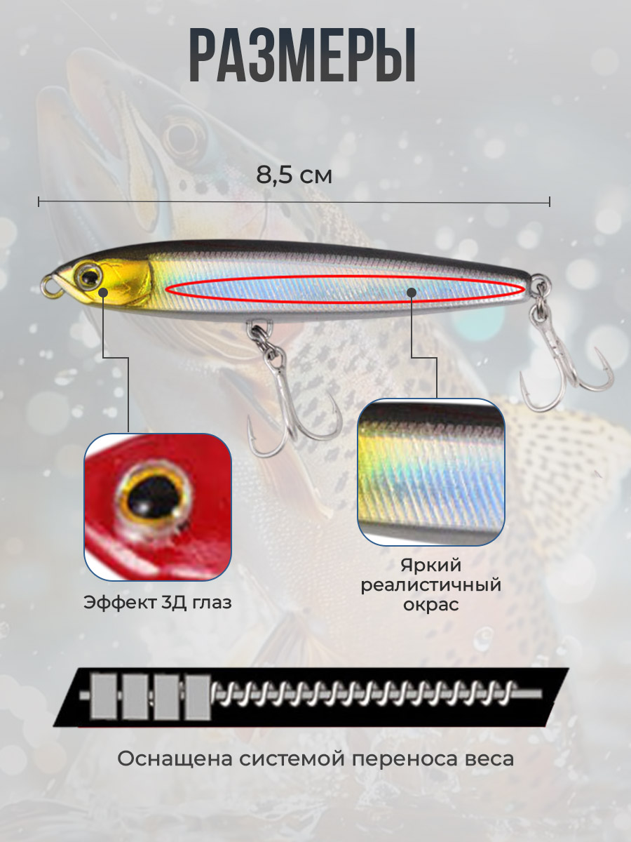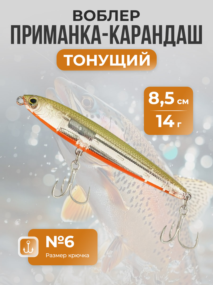 Воблер приманка-карандаш, тонущая, с системой гравитационной передачи 8,5 см/14 г, прозрачная
