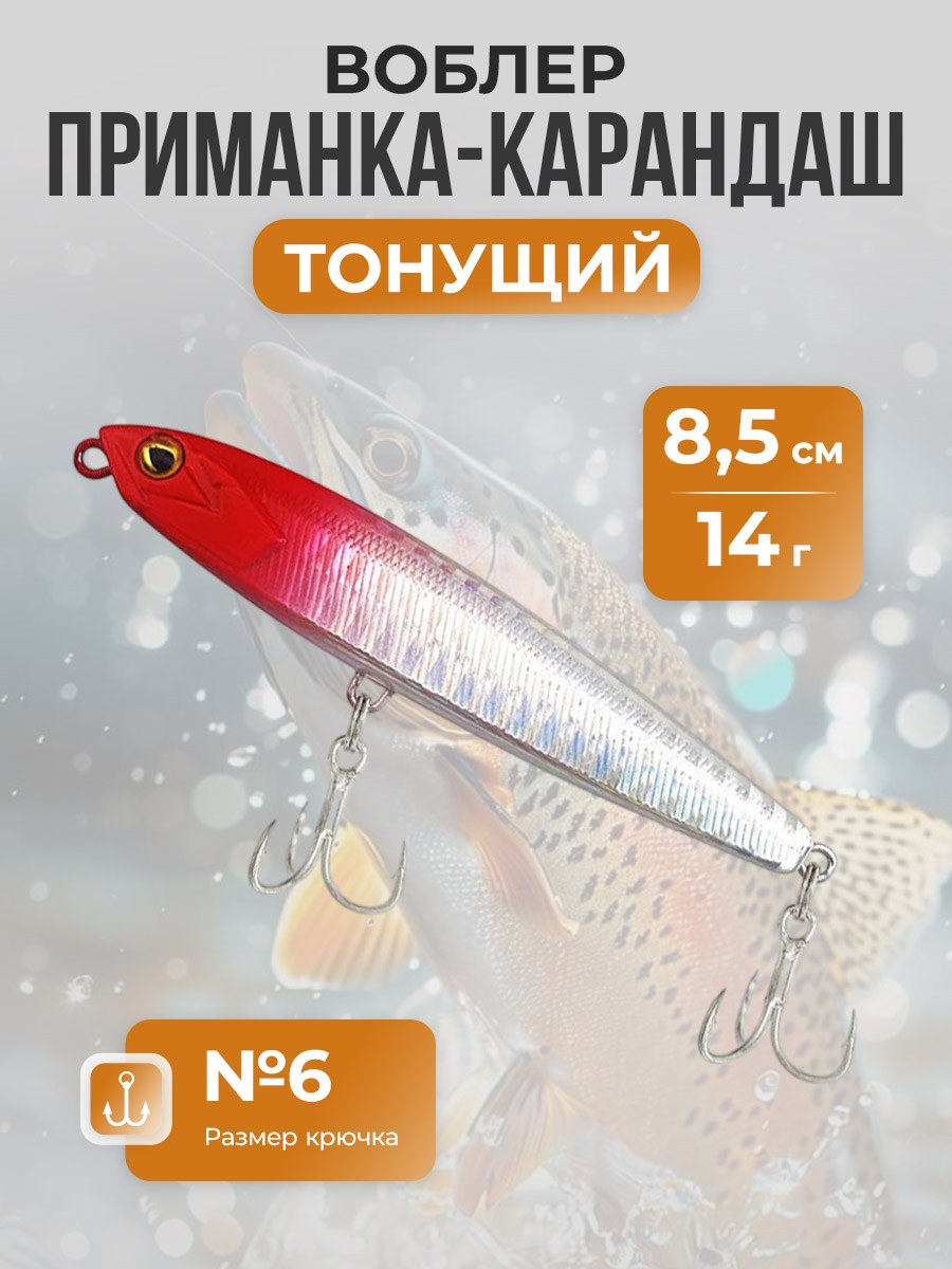 Воблер приманка-карандаш, тонущая, с системой гравитационной передачи 8,5 см/14 г, красно-серебристая