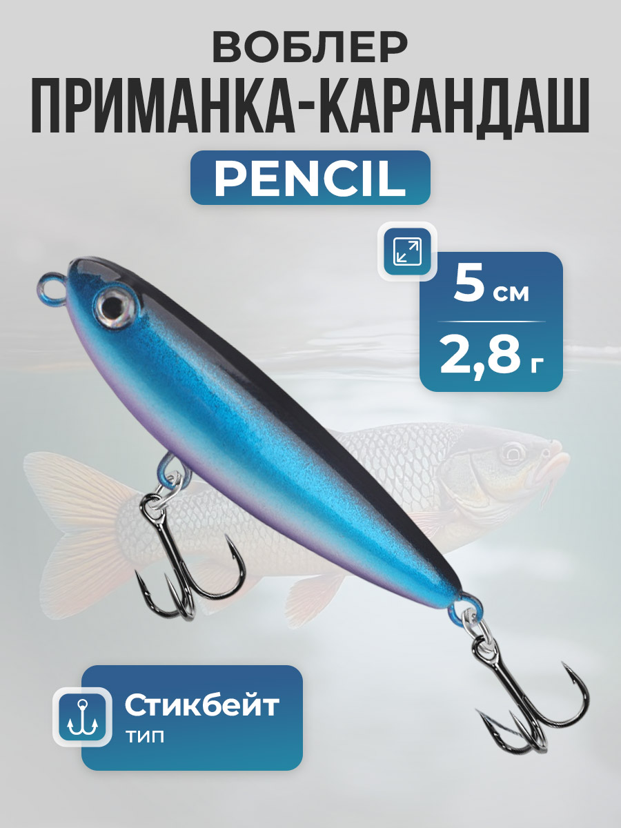 Плавающий воблер-карандаш Pencil / Стикбейт (Stickbait), весом всего 2,8 грамма при длине 5 сантиметров, представляет собой компактное, но необычайно эффективное оружие в арсенале рыболова. Воблер чаще всего используются для активного хищника, который охотится в верхних слоях воды. Он подходит для: окуня, жереха, голавали, язя. А также для форели (на спокойных участках, если провоцировать поверхностную атаку) и мелкой щуки. Поскольку приманка плавающая, то на поверхности она играет "змейкой". А на максимальной рабочей глубине 10-30 см делает более резкие рывки.