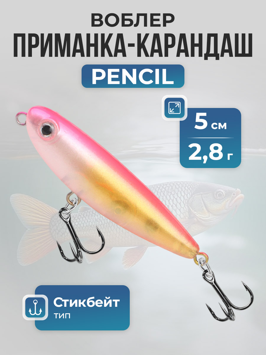 Плавающий воблер-карандаш Pencil / Стикбейт (Stickbait), весом всего 2,8 грамма при длине 5 сантиметров, представляет собой компактное, но необычайно эффективное оружие в арсенале рыболова. Воблер чаще всего используются для активного хищника, который охотится в верхних слоях воды. Он подходит для: окуня, жереха, голавали, язя. А также для форели (на спокойных участках, если провоцировать поверхностную атаку) и мелкой щуки. Поскольку приманка плавающая, то на поверхности она играет "змейкой". А на максимальной рабочей глубине 10-30 см делает более резкие рывки.