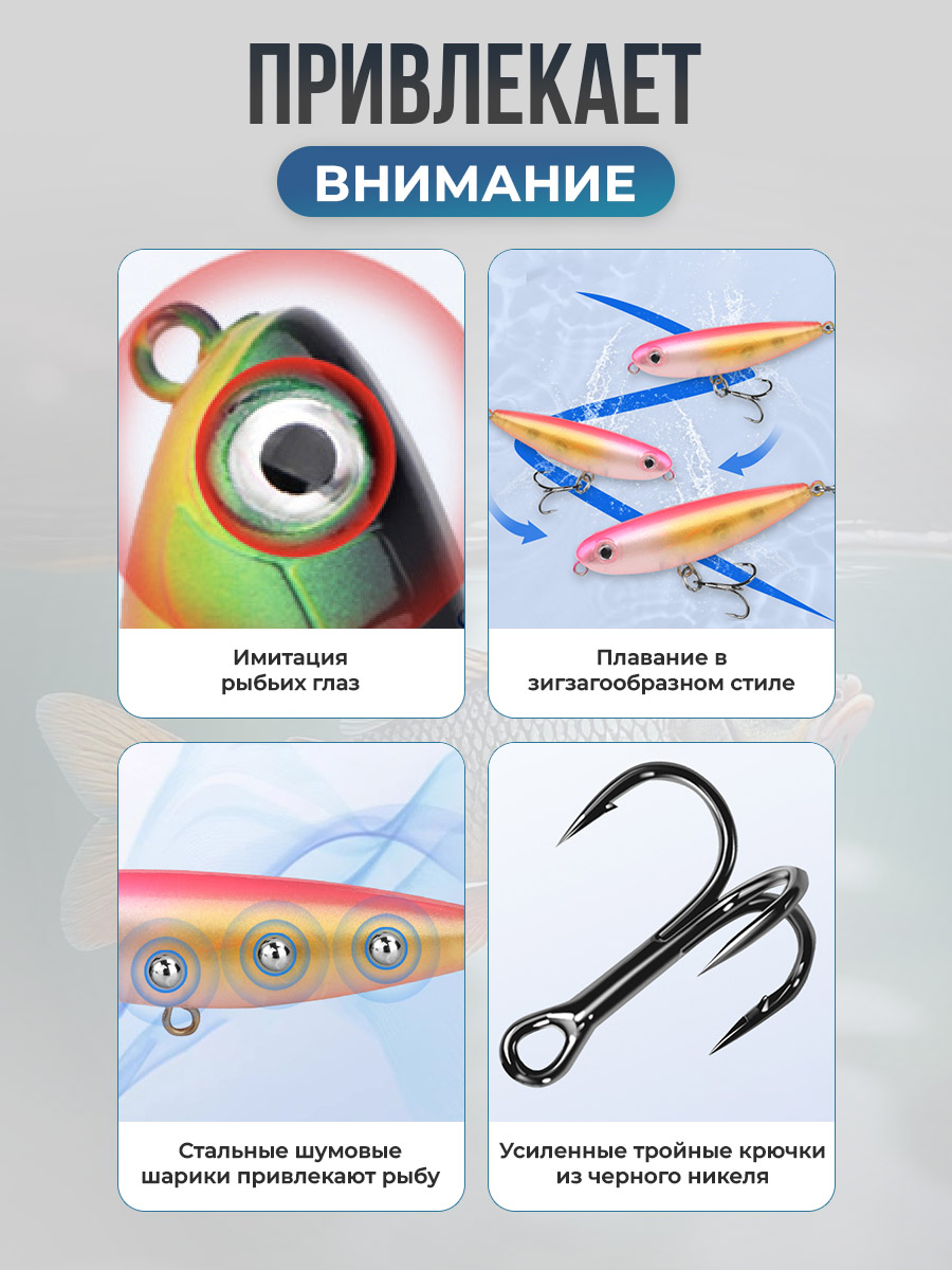 Высококачественные крючки устойчивы к коррозии и сохраняют свою остроту даже после многочисленных контактов с рыбой и подводными препятствиями. Материал корпуса приманки – это прочный и износостойкий пластик, который выдерживает многочисленные атаки хищников и механические воздействия, сохраняя свою целостность и привлекательный внешний вид на протяжении долгого времени. Детализированная окраска и реалистичные глаза придают воблеру ещё большую схожесть с настоящей добычей, провоцируя хищника на решительную атаку.