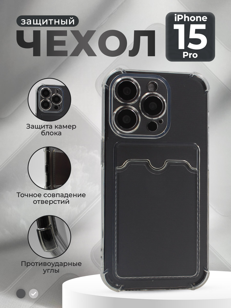 Противоударный чехол с картхолдером для iPhone 15 Pro, прозрачный