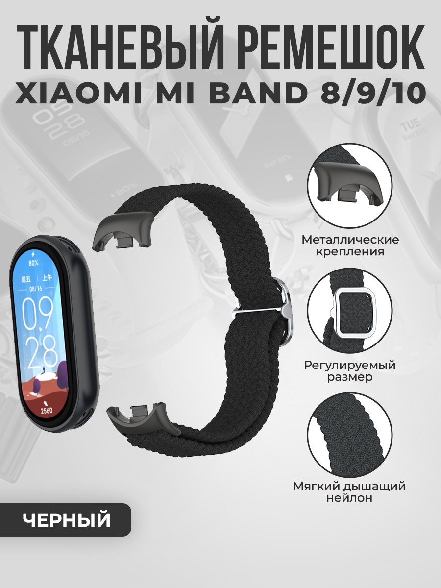 Тканевый ремешок для Xiaomi Mi Band 8/9/10, регулировка по длине, черный