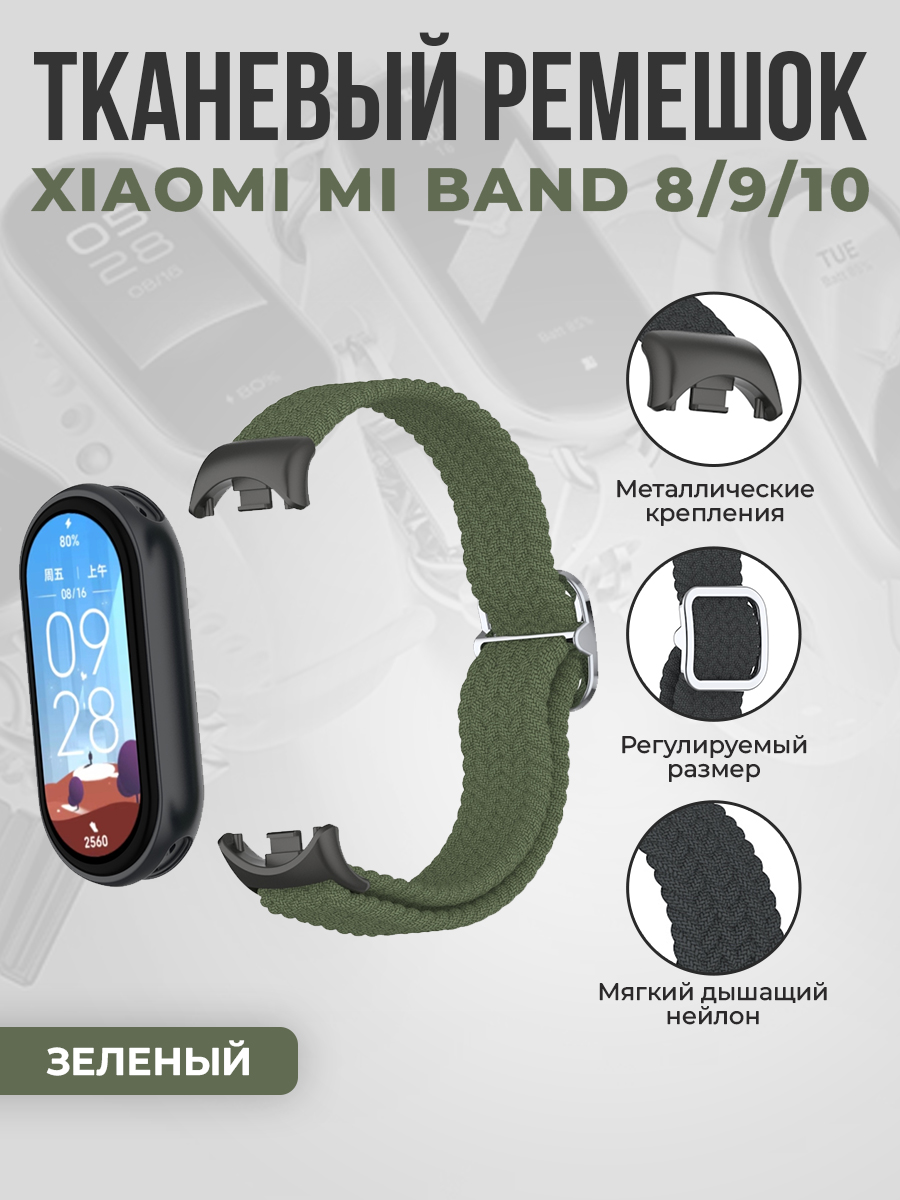 Тканевый ремешок для Xiaomi Mi Band 8/9/10, регулировка по длине, зеленый