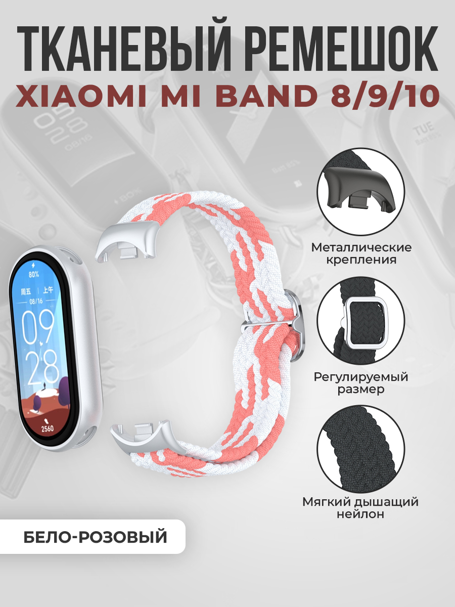 Тканевый ремешок для Xiaomi Mi Band 8/9/10, регулировка по длине, бело-розовый