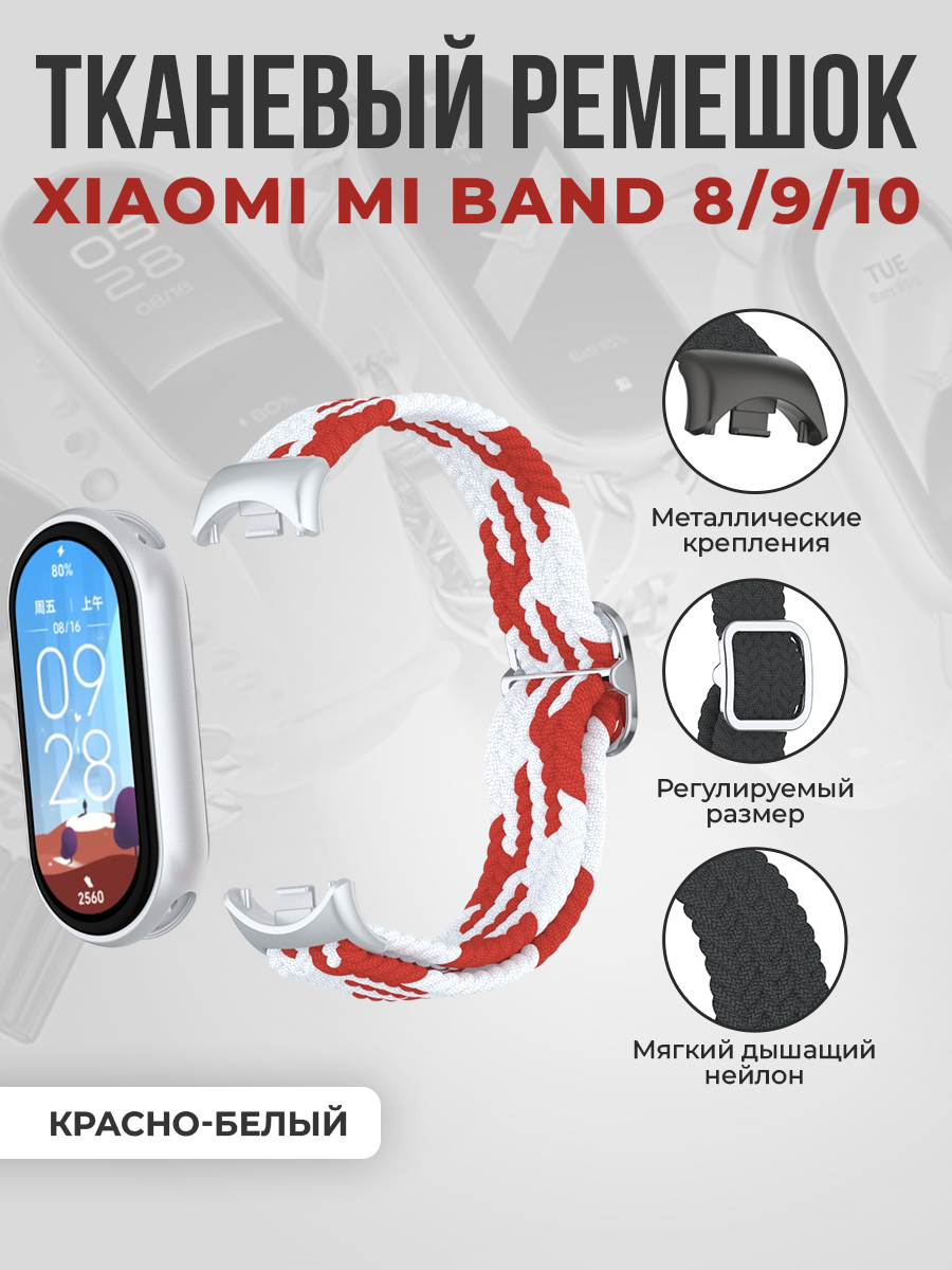 Тканевый ремешок для Xiaomi Mi Band 8/9/10, регулировка по длине, красно-белый