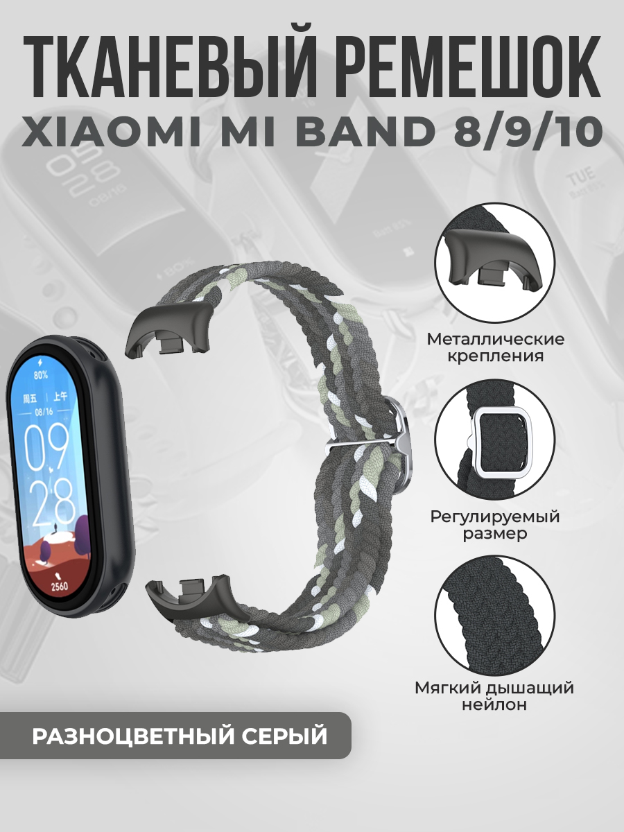 Тканевый ремешок для Xiaomi Mi Band 8/9/10, регулировка по длине, разноцветный серый