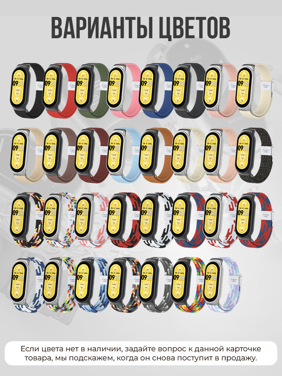 Представляем вашему вниманию стильный и практичный тканевый ремешок для Xiaomi Mi Band 8/9/10 с металлической застежкой, который станет идеальным аксессуаром для ваших фитнес-часов. Этот ремешок xiaomi mi band 9 с продуманным дизайном обеспечит не только надежность, но и комфорт в повседневном использовании. Изготовленный из высококачественного плетеного материала, данный ремешок для ми бэнд 9 сочетает в себе легкость и прочность. Отличная воздухопроницаемость ткани обеспечивает максимальный комфорт во время тренировок, а ремень ми бенд 9 металл придает ему стильный и современный вид. Этот ремень для xiaomi mi band 10 идеально подходит для активных пользователей, стремящихся вести здоровый образ жизни с комфортом и стилем. Благодаря инновационной конструкции, ремешок для ми банд 9 металлическая застежка надежно фиксируется на запястье и позволяет легко регулировать длину. Вы сможете адаптировать ремешок mi band 8 плетеный с регулировкой под свои индивидуальные размеры, что делает его универсальным продуктом для всех. Также данный плетеный ремешок для xiaomi band 10 с прочной застежкой уверен в своем долговечном использовании, что позволяет вам сосредоточиться на достижении ваших фитнес-целей. Этот браслет для фитнес часов плетеный – это не только функциональный аксессуар, но и стильное дополнение к вашему образу. Выбирайте из разнообразия цветовых решений и станьте обладателем ми бенд 8 плетеный ремень, который подчеркнет вашу индивидуальность. Попрощайтесь с привычными пластиковыми ремешками и выберите плетеный ремешок mi band 8, который обеспечит вам уникальное сочетание стиля, комфорта и надежности. Обновите свой образ и наслаждайтесь качеством с тканевым ремешком для Xiaomi Mi Band 8/9/10 с металлической застежкой!