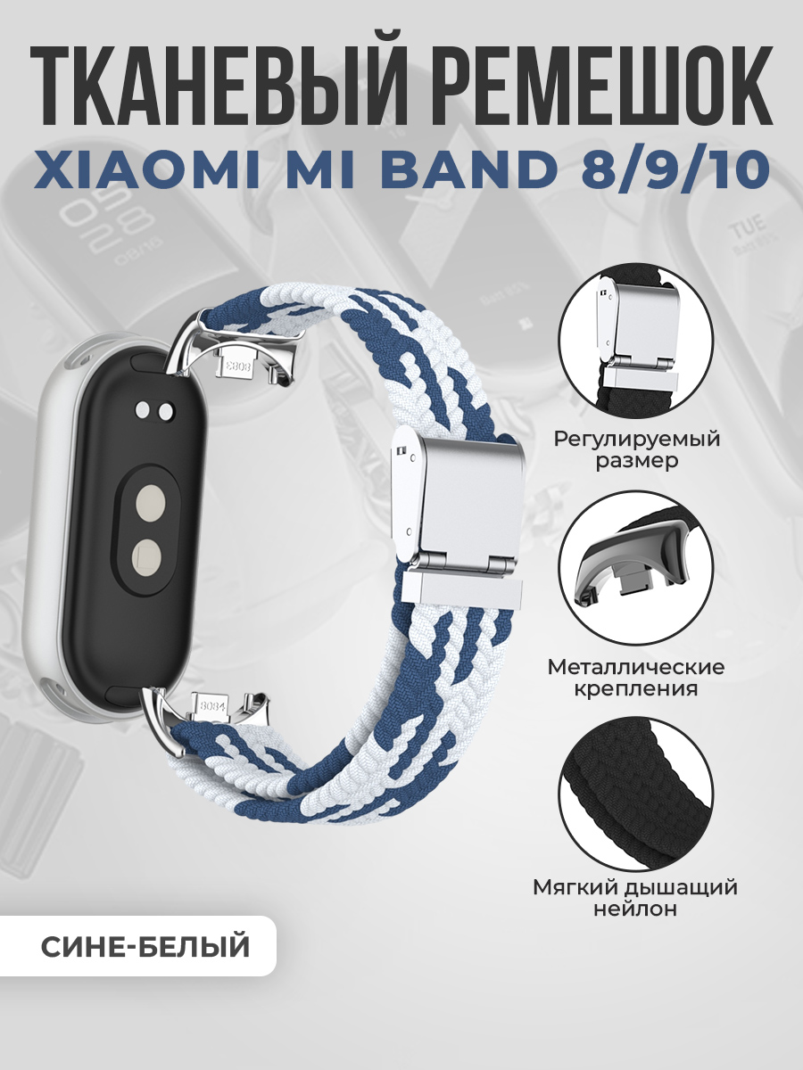 Тканевый ремешок для Xiaomi Mi Band 8/9/10, металлическая застежка, сине-белый